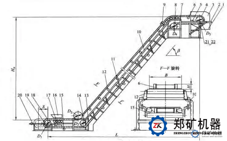 1、卸料漏斗 2、头架 3、头部护罩 4、传动滚筒 5、头部清扫器 6、挡边带 7、头部压带轮装置 8、压带轮 9、挡带辊 10、中间架 11、支腿 12、平行上托辊 13、尾部压带轮装置 14、改向滚筒 15、复式下托辊 16、导料槽 17、空段清扫器 18、尾部滚筒 19、拉紧装置 20、尾架 21、驱动装置 22、逆止器。