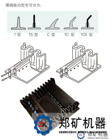 输送带为挡边带,挡边带由基带、挡边和隔板组成,基带的外观与普通输送带相同,但具有更大的横向刚度。挡边做成波状是为了使输送带能绕过各滚筒凸、凹弧区段,以满足输送线路的要求。波纹的形状可以是正弦波、方波、W形波等。在两挡边之间的基带上,有按一定间距布置的隔板。隔板按其不同的断面可分为T型、TS型、C型、TC型、TCS型。