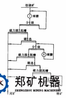 酒钢选矿厂生产流程见图1。其焙烧矿弱磁选流程与一般磁选流程基本相同,原则流程见图2。流程中,有时配合有螺旋溜槽、旋流器等重选设备。