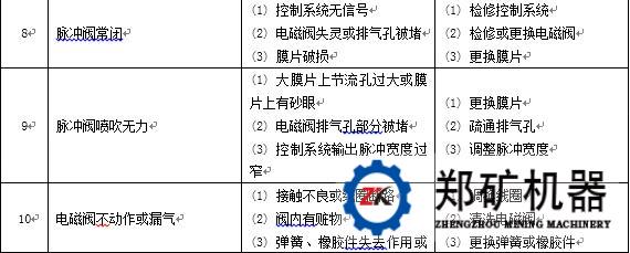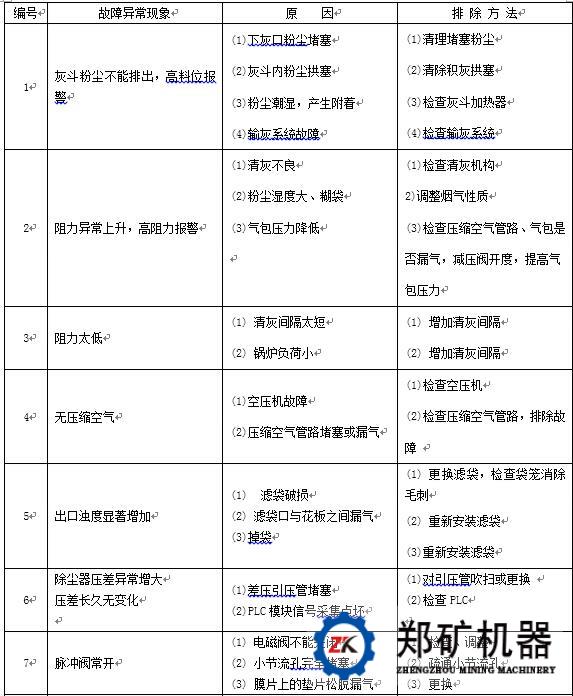 1.1 日常维护与保养 所有和滤袋有关的维护都可以在净气室进行,除尘器顶部的便掀式顶盖用于滤袋等的检查和更换。除尘器有检修平台,用于检查和维护有关清灰系统、电控设备、阀门。 1.1.1作为维护的程序,须周期性地检查以促进“无故障操作”: 1.1.1.1每天:对各仓室压力降、阀、汽缸和进出风阀门的操作进行一次巡环检查,并至少每两小时一次记录; 1.1.1.2每周:对整个清灰循环系统进行观察,确认清灰循环、进出风阀门的操作和PLC操作正常。检查门密封情况检查; 1.1.1.3每月:对所有的进出风阀门控制器、电磁阀、行程开关、电机和设备按其操作功能进行详细检查; 1.1.1.4每年:从每个过滤室中随机抽取一到两条滤袋,分析预测滤袋的使用寿命及需要的更换情况; 1.1.1.5一旦有机会,或至少一年一次,对除尘器各过滤室中花板在净气段可能的积灰、滤袋的状况、灰斗的积灰、电气元件的性能、各阀门的密封泄漏情况进行检查。 1.1.2各部件的维护: 1.1.2.1滤袋: 定期对净气室和滤袋检查,也可根据仓室差压的异常波动去查看有无积灰、水汽或锈斑。一旦有上述情况发生,就说明有滤袋破损或操作条件不对。 1.1.2.2电控元件: 和除尘器其他部件一样,电控元件不需要定期服务,然而,我们应利用常有的间隙对其进行检查。电磁阀等整装元件的检查可以用替换的方式检查,坏的元件送厂家修理。 1.1.2.3电磁脉冲阀: 1)膜片阀的故障可能是因为连续的激励、内部杂质的堆积、膜片的过度磨损或磨损的火塞塞住了壳管。 2)膜片阀的开启故障可以通过过量的压缩空气管道的压力降或阀的连续漏气声音来检测。找到问题原因后,*先去掉系统压力,再拆除阀盖,检查膜片的密封处是否有杂物、膜片是否损坏、弹簧是否失效。 3)不要试图在系统压力未去处的情况下拆开膜片阀。 4)关闭故障的原因可能是激励信号太弱、线圈故障、内部杂质的堆积或活塞磨损过度。 5)膜片阀的关闭故障检测可以通过激励电磁阀时过分轻的脉冲声音来检查。如果电磁阀不动作或电磁部分动作但阀不动作,说明电磁操作或控制器有问题,需要更换。 6)电磁阀的检查包括在电源断开时所有的连接是否紧密,阀的操作是否正常。 1.1.2.4除尘器状况: 1)除尘器室内的水汽现象,像小水洼或锈斑,是水汽或热烟气中的酸的冷凝或从外面渗漏进来的。 2)水汽问题是因为操作温度的保温不够而造成热烟气的冷凝而导致的,或因为过滤室的关闭时间过长且关闭时内部烟气温度过高,增加保温或纠正操作规程来消除这个问题。 3)如果水汽是因为渗漏的原因,**的堵漏方法是先清理,再嵌以环氧或硅酮密封胶,可以用密封焊的方式堵漏,但焊接前一定要拆除滤袋或盖住滤袋以防止焊接火花的伤害,这类伤害对滤袋而言可能是致命的。 4)检修门的渗漏一般是因为门的不正确紧固或密封垫的问题。正确紧固检查门、更换老化、变形的密封垫以解决检查门的渗漏。 1.1.2.5除尘器的压力降: 1)系统的压力降是除尘器性能和状态的**体现。通过操作日志,不正常的压力降型号指示应立刻检查! 2)过低的压力降表明系统有泄露,检查烟囱是否冒烟、花板上是否有积灰。 3)过高的压力降表明的原因有很多:滤料堵塞、清灰系统故障、进出风阀故障、灰斗积灰过多、压差表的管路堵塞。 1.1.2.6滤袋: 在保修期间出现的滤袋破损,必须有更换记录,记载更换的室和滤袋位置、更换日期,连同损坏的滤袋交供货商分析。 1.1.2.7滤袋拆卸: 1)关闭并锁住过滤室的进出风阀: 2)对要进入的过滤室进行3-4次的清灰操作; 3)打开该室门通风,确认过滤室内冷却后进入,人员进入过程中应借助风扇往里面持续吹新鲜空气; 4)操作过程中,保持灰斗检查门的开启; 5)更换一条滤袋,应该从顶部将滤袋和袋笼一起拉出,有时需要抽出几条滤袋以检查具体情况。 1.2常见故障原因分析及处理方法