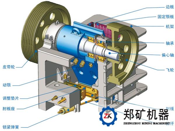一、颚板和侧护板 定颚和动颚都由颚床和颚板组成,颚板是工作不分,用螺栓和楔铁固定在颚床上。定颚的颚床就是机架前壁,动颚颚床悬挂在周上,要有足够的强度和刚度,以承受破碎反力,因而大多是铸钢或铸铁件。 二、机架 机架是上下开口的四壁刚性框架,用作支撑偏心轴并承受破碎物料的反作用力,要求有足够的强度和刚度,一般用铸钢整体铸造,小型机也可用优质铸铁代替铸钢。大型破碎机的机架需分段铸成,再用螺栓牢固链接成整体,铸造工艺复杂。自制小型破碎机的机架也可用厚钢板焊接而成,但刚度较差。 三、调节装置 调节装置有楔块式,垫板式和液压式等,一般采用楔块式,由前后两块楔块组成,前楔块可前后移动,顶住后推板;后楔块为调节楔,可上下移动,两楔块的斜面倒向贴合,由螺杆使后楔块上下移动而调节出料口大小。小型颚式破碎机的出料口调节是利用增减后推力板支座与机架之间的垫片多少来实现。 四、飞轮 颚式破碎机的飞轮用以存储动颚空行程时的能量,再用于工业形成,使机械的工作符合趋于均匀。带轮也起着飞轮的作用。飞轮常以铸铁或铸钢制造,小型机的飞轮常制成整体式。飞轮制造,安装时要注意静平衡。 五、传动轴 偏心轴是破碎机的主轴,受有巨大的弯扭力,采用高碳钢制造。偏心部分须精加工、热处理、轴承衬瓦用巴氏合金浇注。偏心轴一端装带轮,另一端装飞轮。 六、润滑装置 偏心轴轴承通常采用集中循环润滑。心轴和推力板的支撑面一般采用润滑脂通过手动油枪给油。动颚的摆角很小,使心轴与轴瓦之间润滑困难,常在轴瓦底部开若干轴向油沟,中间开一环向油槽使之连通,再用油泵强制注入干黄油进行润滑。