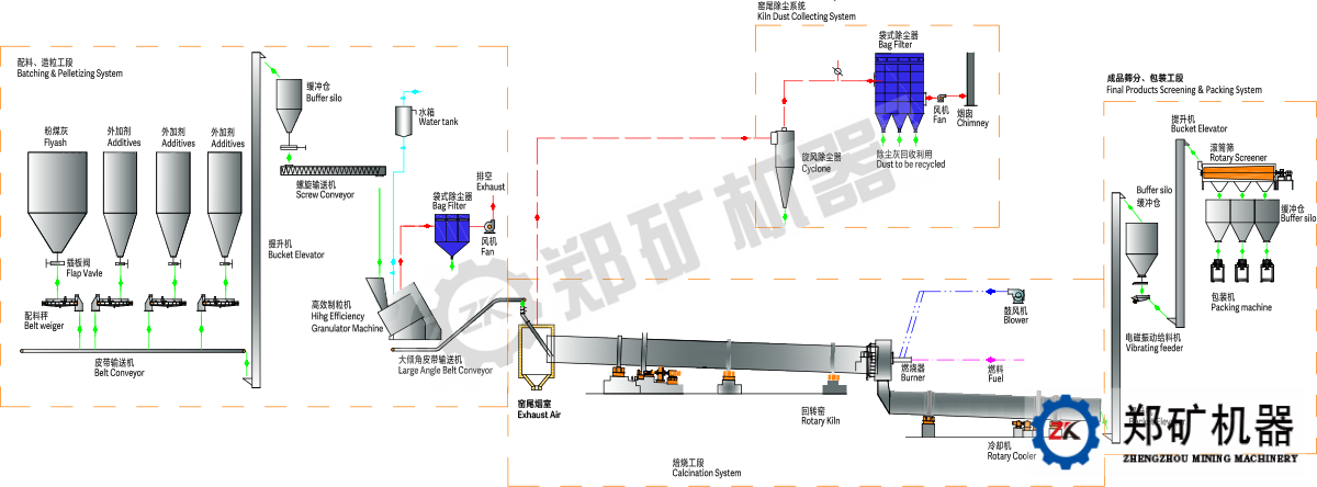 配料——混合——烧结——分级——成品。